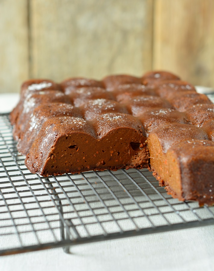 Et pourtant, malgré le peu de matière grasse qu’il contient, ce gâteau est ultra fondant. Alors, sur les photos, on dirait presque un flan mais la photo ne reflète pas du tout la réalité, c’est la coupe qui donne cette impression. Quand on mord dedans c’est une texture incroyable, vraiment très fondante, je ne sais pas comment expliquer mais il fait un peu truffé ou comme une mousse au chocolat bien ferme. Difficile de croire qu’il n’y a pas de beurre dans la recette !